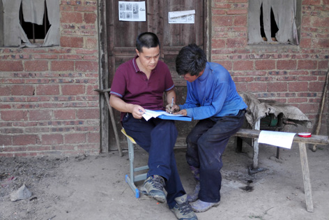 圖為婁燕明(左一)協(xié)助村委會(huì)工作組織村民簽訂安全責(zé)任書(shū)