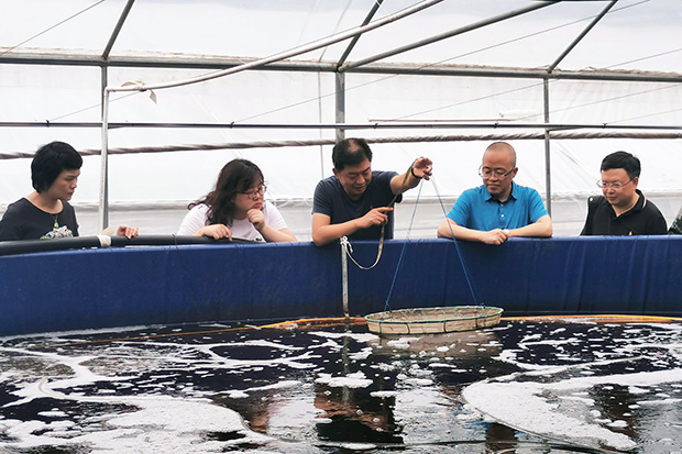 圖為調(diào)研組現(xiàn)場(chǎng)考察該村南美白對(duì)蝦養(yǎng)殖扶貧項(xiàng)目建設(shè)情況